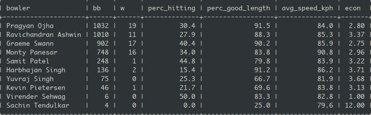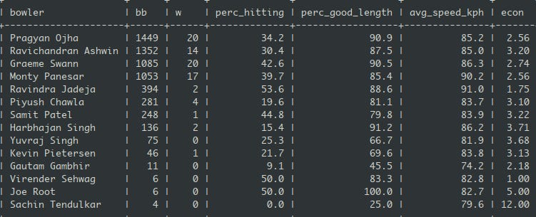 The ball-tracking records of both these series are available on the BCCI’s media website1. The tables below summarize how often each bowler attacked the stumps, how often each bowler hit a good length (between 3 and 6 metres for a spinner), and the average speed at which each bowler bowled.