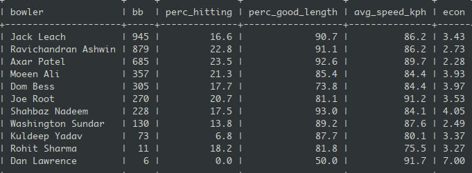 By comparison, Dom Bess and Moeen Ali - England’s two off-spinning options in this series, when considered together, have missed their length 20% of the time (once every 5 balls). They’ve attacked the stumps 19.6% of the time, and they’ve conceded 3.95 runs per over. Joe Root - a part-time off spin bowler - also misses his length once every 5 balls, but he’s been the quickest spinner on show in the series. England’s off-spinning options in this series have been of the quality of a part-timer.